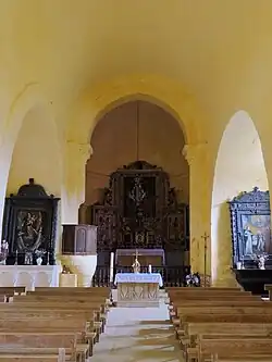 Chœur et arc triomphal. Au-dessus du maître autel, le tabernacle et le retable Chapelle nord : retable du Rosaire avec saint Dominique et sainte Scolastique