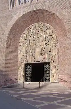 Le portail est l'œuvre d'Anne-Marie Roux-Colas[8]. Au milieu des neuf chœurs des anges, sainte Odile est introduite au ciel par la Vierge Marie. Celle-ci la présente à son Fils vêtu d'une chasuble qui rappelle son rôle de prêtre éternel, au Père qui bénit le monde de sa main et à l'Esprit Saint que symbolise une colombe. Au pied de la sainte, des anges portent un livre et une église. Le livre contient la règle de la communauté monastique ; l'église représente vraisemblablement la maquette de la première église construite sur le mont Sainte-Odile à l'époque de la sainte. Devant elle, un autre ange porte sa crosse de mère abbesse. Tout autour de la Trinité est écrit : « Veni Odilia Sponsa Christi accipe coronam quam tibi Dominus praeparavit in aeternum » (« Viens, Odile, épouse du Christ, reçois la couronne que le Seigneur t'a préparée dans l'éternité »)[3],[8].