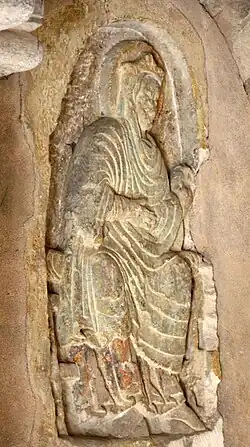 Dans le porche, deux reliefs se font face. Ils sont taillés en cuvette. Ils sont issus de l'ancienne façade romane et ont été apposés en remploi. L'un de ces reliefs représente le Christ en Majesté. L'autre montre une femme assise qui pourrait représenter sainte Radegonde ou la Vierge ou une personnification de l’Église. Elle est couronnée et nimbée, voilée et revêtue d'une robe aux plis dessinant des cercles concentriques. Elle s'incline vers la gauche. De cette position, il est possible de déduire que les deux reliefs sont les vestiges d'un seul ensemble sculpté. La sainte devait se trouver placée à la droite du Christ. Des traces de polychromie sont encore visibles.