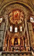 L'abside est heptagonale[13]. Elle est enveloppée par un déambulatoire possédant des chapelles rayonnantes semi-circulaires. Ces dernières sont de style roman. La chapelle axiale, qui date du XIe siècle, est dédiée à la Vierge.