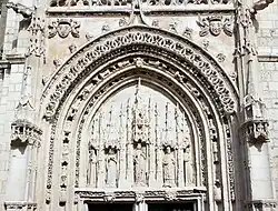 Le portail de style gothique flamboyant est du XVe siècle, tout comme le rare parvis qui est conservé. Il s'agit d'un parvis de justice, entouré de bancs de pierre, sur lesquels siégeaient les juges ecclésiastiques jugeant les affaires religieuses et civiles du bourg.