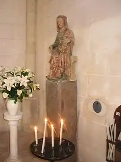 - Vierge à l'enfant (pierre peinte XIVe siècle). Assise sur un trône, c'est la Vierge reine.