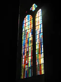 - Les vitraux modernes ont été réalisés par un suzannais, Alain de Bourgues, artiste peintre, professeur au Musée-école de la Perrine à Laval. Inaugurés en 1979, ils donnent par leurs lignes verticales un élan à l'ensemble de l'édifice, et contribuent par le jeu des couleurs à créer une atmosphère de prière et de recueillement.