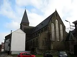 L’église des Saints-Antoine-Ermite-et-Apolline[1], de style néo-gothique, a été bâtie en moellons de grès du Condroz. Elle possède une nef de six travées, un transept et un chevet à trois pans coupés. La tour du clocher est étonnement dressée du côté nord de l'édifice, entre le transept et le chevet.