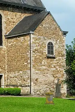 L'église, recouverte d'une vaste toiture d'ardoises, est édifiée en moellons de grès[1]. La pierre calcaire a été utilisée pour les encadrements des baies et pour les chaînages d'angle ainsi que pour la construction du chevet gothique et du porche adossé à la façade nord.