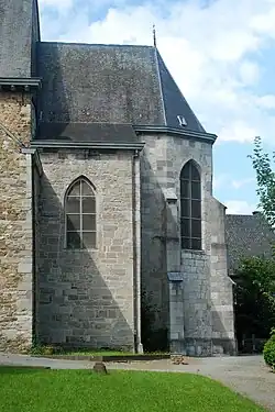 À l'est, l'église se termine par un chevet gothique à trois pans édifié en 1512 en pierre de taille assemblée en grand appareil.
