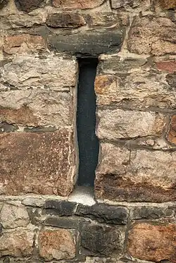 La façade méridionale présente deux couleurs de maçonnerie différentes : moellons bruns sur toute la longueur de la façade et moellons de couleur olivâtre à l'extrémité ouest de la façade.