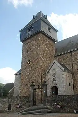 Cette massive tour carrée, édifiée en moellons bruns comme l'ensemble de l'église, présente des chaînages d'angle en pierre plus claire et est percée de fines meurtrières.