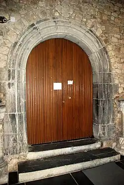 Le porche adossé à la façade nord abrite un portail en marbre noir de Theux[1] dont les piédroits moulurés sont ornés d'une fine colonnette qui repose sur une base octogonale et se prolonge au niveau de l'arc en plein cintre.