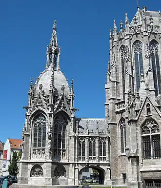De plan hexagonal avec voûte en dôme hexagonal hérissé, la chapelle est haute de 28 mètres. Au sommet se trouve une tourelle ouverte aux quatre vents, avec une courte flèche protégeant une couronne royale de bronze. L’extérieur de la chapelle est abondamment décoré d’éléments gothiques. Dans les angles extérieurs de la chapelle se trouvent des niches avec des statues de quatre saintes reines : sainte Clotilde, sainte Bathilde de Chelles , sainte Élisabeth de Hongrie et sainte Élisabeth du Portugal.