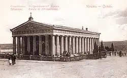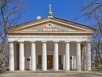 L'église est un pur exemple de néoclassicisme à la grecque, inspiré du Parthénon, avec 44 colonnes à cannelures. Elle est construite en pierre calcaire. La façade est surmontée d'un fronton triangulaire surmonté d'une croix. Le fronton oriental montre un relief avec l'œil de la Providence. De chaque côté de l'entrée principale, l'on remarque des mosaïques représentant saint Pierre et saint Paul dont les originaux (disparus pendant la guerre de Crimée) étaient l'œuvre de Ferdinando Peliccio[5].