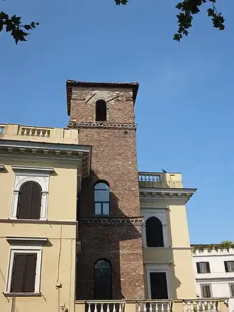 Du Lungotevere della Farnesina, il est possible de voir le clocher roman de l'église, datant du XIIe siècle et le seul élément médiéval survivant.