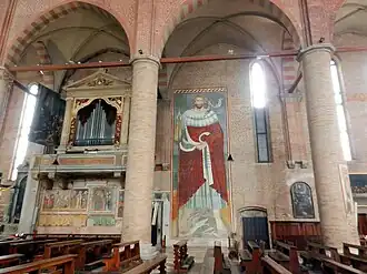 Les colonnes, qui tiennent un simple plafond en bois carénato, montrent des fresques de Tommaso da Modena, au niveau de la deuxième colonne sur la gauche, représentant saint Jérôme, sainte Agnès et saint Romuald. D'autres fresques de l'église sont attribuées à son école, mais pas directement au maître. Il y a douze colonnes, comme le nombre des apôtres, parmi lesquelles les deux premières sont en pierre.