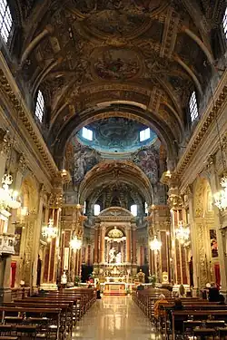 À l'intérieur, les voûtes sont décorées de fresques représentant des scènes de Saint Paul dans l'Aréopage d'Athènes par Antonio et Giuseppe Rolli[3]. La coupole, l'abside, la sacristie et les deux chapelles du transept sont décorées de fresques en quadratura par Pietro Farina et de figures par Giuseppe Antonio Caccioli[4].