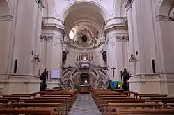 L'église s'inscrit dans un plan circulaire avec une nef et des chapelles latérales. La caractéristique la plus spectaculaire de l'intérieur, c'est l'abside avec son maître-autel auquel on accède par un majestueux escalier à double rampe.