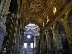 La contre-façade montre une fresque du Martyre de Sainte Catherine et la voûte Les Noces mystiques de sainte Catherine, de la fin du XVIIe siècle par Garzi. La coupole élancée est remarquable avec ses lésènes d'ordre corinthien en piperno et son fond de couleur blanche; c'est la première du genre à Naples comme le rappelle le chanoine Celano (it) dans un guide Naples de 1724[4]. En 1712, Paolo de Matteis décore la coupole de fresques; celle du milieu représente La Vierge, sainte Catherine et les patrons de Naples implorant la Trinité en faveur de la ville.