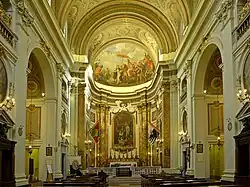 L'intérieur a une seule nef avec quatre chapelles latérales, un chœur et une abside légèrement surélevés. Dans les panneaux qui décorent la voûte en berceau, deux peintures à la détrempe représentent des Anges musiciens, œuvre d'Ermenegildo Costantini. Les murs sont décorés de quatre ovales de chaque côté peints par Ignazio Morlà, Tommaso Conca, Étienne Parrocel et Pietro Angeletti.