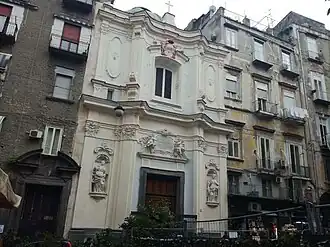 L'église est insérée entre deux corps de bâtiment autrefois parties intégrantes du couvent et aujourd'hui immeubles d'habitation. La façade présente des lésènes corinthiennes adossées à des pilastres inclinés qui encadrent la partie centrale. Le portail est en piperno surmonté d'une décoration de stuc et d'une plaque de marbre flanquée de chaque côté d'un ange.