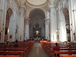 L'intérieur s'inscrit dans un plan à croix latine à nef unique, avec huit chapelles latérales. Le majestueux maître-autel est surmonté d'un tableau de Notre-Dame du Carmel. La première chapelle à droite et la première chapelle à gauche possèdent des toiles de Paolo de Matteis datant de 1693. Elles représentent Saint Michel Archange et Le Miracle de saint Antoine. Dans le bras gauche du transept, on remarque un groupe sculpté de bois figurant la Crucifixion avec la Vierge et saint Jean, signé de Nicola Fumo (it).