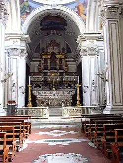 L'intérieur s'inscrit dans une croix latine à nef unique et cinq chapelles. Le plafond présente des toiles de Vaccaro de 1728 : La Gloire de saint Benoît, Saint Benoît et Saints bénédictins. Vaccaro est également l'auteur du pavement de marbre de la nef.