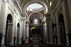 À l'intérieur, une croix latine articulée en une seule nef avec des chapelles, on trouve des œuvres de nombreux sculpteurs et peintres de l'époque baroque, dont Paolo de Matteis et l'artiste flamand Niccolò de Simone, un tombeau de Tito Angelini, des statues de Domenico Antonio Vaccaro, des bustes de Matteo Bottiglieri, Angelo Viva et quelques décorations de Costantino Marasi.