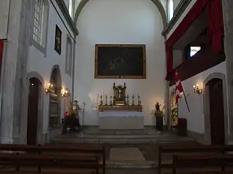 Sur les côtés, il y a deux panneaux d'azulejos représentant des scènes de la prise de Lisbonne aux Maures et de la Praça do Comércio. Le plan de l'église est en croix latine.
