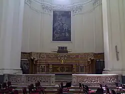 Le maître-autel de bois est décoré de stucs avec des panneaux de faux marbre.