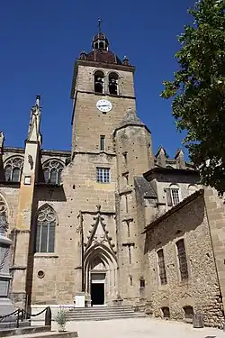 La façade flamboyante est plaquée sur la nef. Elle comprend trois portails surmontés d'une balustrade. Reprenant une disposition de la cathédrale Saint-Maurice de Vienne, au-dessus du portail médian a été placée une baie flamboyante.