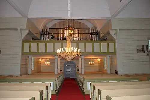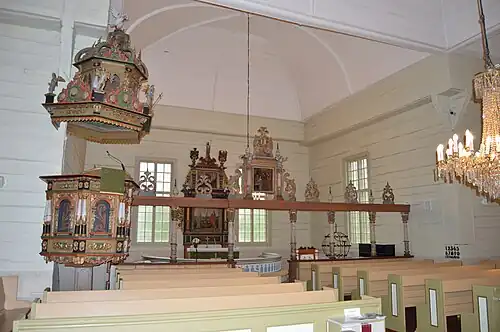 La nef est couverte de cinq coupoles voûtées d'égale hauteur et dotées d'un anneau central et de poutres. Les parties centrales de l'intérieur de l'église ont été offertes par Casper Wrede, détenteur du fief d'Elimäki, et son épouse Sofia Taube[1]. Ils comprennent une jubé de style baroque de 1666, un retable avec de 1632 et une chaire[1].