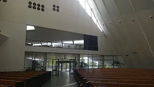 De larges fenêtres permettent de bénéficier d'un éclairage de lumière naturelle. L'éclairage de la nef est conçu pour que l'attention se porte vers l'autel. Le retable est une fenêtre ouvrant la vue sur le parc de l'église. Une croix basse est posée sur l'autel. La nef a une capacité de 630 sièges, la balustrade de l'orgue et la salle supérieure permettent d'accueillir 250 personnes en plus[1].