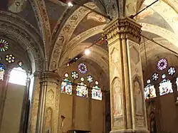 À l'intérieur, de nombreuses fresques de la fin du XIVe siècle (recouvertes de plâtre au XVIIIe siècle et redécouvertes lors des restaurations du XIXe siècle) décorent les piliers, certains murs, ainsi que les segments des voûtes. Le cycle pictural des voûtes, exécuté en 1398-1399, représente des personnages de l'Ancien et du Nouveau Testament , selon un programme iconographique conçu par Franco Sacchetti. La première travée de la nef gauche présente des voûtes décorées de fresques de Lorenzo di Bicci (par attribution), avec les figures d'Ève, Rachel, Rebecca et Sara ; la deuxième travée à droite présente Judas Macchabée et David attribués à Ambrogio di Baldese, et Moïse et Josué, attribués à Spinello Aretino ; les deux travées des autels présentent des fresques attribuées à Mariotto di Nardo, avec le Père éternel et trois saints, et la Vierge avec trois saints[1].