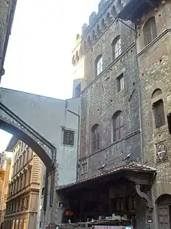 Une passerelle en pierre au Ier étage permet le passage entre Orsanmichele et le Palazzo della Lana (palais d'une des Arti, les riches corporations marchandes de la ville et responsables de la bonne marche de la construction du Duomo sur les plans de Filippo Brunelleschi).