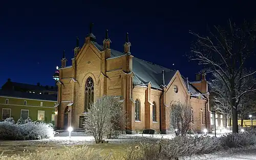 La conception de l'église est due à Frans Ludvig Calonius , l'architecte de la ville de Tampere. L'église est de style néogothique[2]. Le matériau de la façade de l'église est de la brique rouge. Elle ressemble à une église congrégationaliste anglaise dans la mesure où la chaire et l'orgue de l'église sont situés derrière l'autel, contrairement à l'habitude en Finlande.