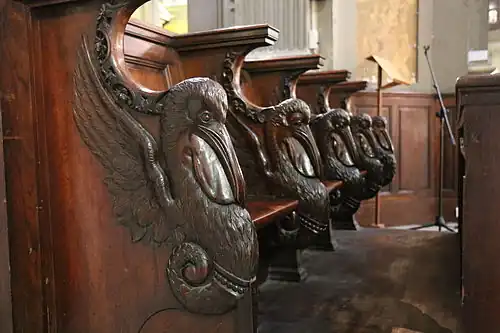 Une tribune édifiée en 1862 est ornée de deux bustes représentant des saints liés à la musique sacrée. À gauche le roi David à qui est traditionnellement attribuée l'écriture des psaumes : sur le piédestal sont gravées une harpe et une colombe du Saint-Esprit. À droite, le pape saint Grégoire le Grand à qui on a attribué la création du chant grégorien : sur le piédestal sont gravés un pupitre, un instrument de musique, un livre, une plume, les clés de saint Pierre et la colombe du Saint-Esprit.