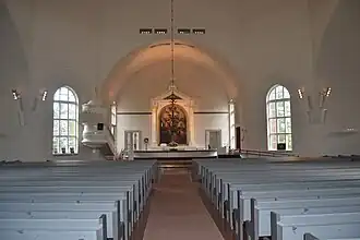 Le clocher séparé est construit par Heikki Kuorikoski en 1823. les orgues à 36 jeux sont fournis en 1963 par la fabrique d'orgues de Kangasala.