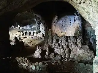 À l'intérieur, plusieurs groupes sculpturaux le décorent, également en tuf. L'église est adjacente à la plage et étant exposée à l'ouest, une visite l'après-midi est très évocatrice, lorsque les rayons du soleil pénètrent dans les profondeurs des grottes, soulignant les couleurs des sels minéraux qui recouvrent les parois.