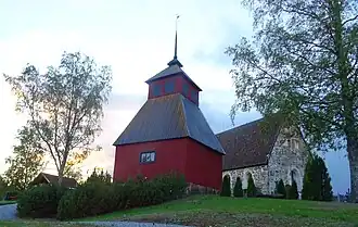 Le clocher peint en rouge est bâti du côté sud-est de l'église en 1744. Sa base en pierre a été aménagée en morgue en 1927[2],[3].