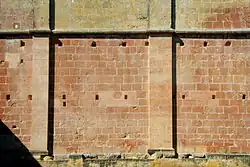 - Sur la première et deuxième travées, les pierres sont un peu différentes dans la partie inférieure. Elles sont en pierre plus grossièrement taillées.