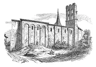 Les murs de cette église primitive ont été conservés lors de l'élévation de l'église actuelle. On peut en effet observer sur le mur sud du bâtiment actuel (au niveau des ruines du cloître), que :