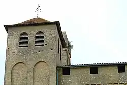L'entrée est surmontée d'un crénelage et de deux clochers datant du XIIIe siècle. Le clocher nord a été partiellement détruit au cours des guerres de Religion.