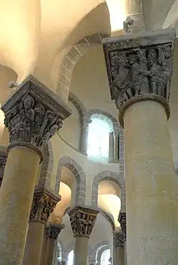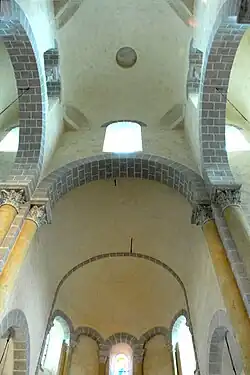L'intérieur n'est pas polychrome comme à Issoire, à l'exception des chapiteaux du rond-point et du déambulatoire.
