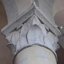 Les chapiteaux du rond-point représentent les Saintes Femmes au tombeau, la Passion du Christ, la descente aux limbes et la Transfiguration[2].