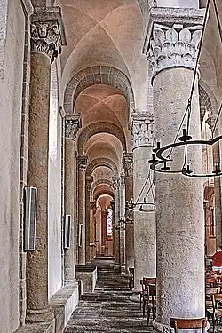 Les deux nefs latérales sont beaucoup plus complexes. On retrouve ici la même division en quatre travées que dans la nef centrale. En face des colonnes des arcades se trouvent des pilastres. Des arcs doubleaux de la largeur des colonnes s'appuient à l'extérieur sur les consoles en plein cintre à chapiteaux sculptés, et à l'intérieur sur les grands chapiteaux des colonnes qui délimitent les travées. Chaque travée possède sa propre voûte d'arête, dont la forme est originale.