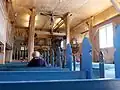 Le cimetière de l'église s'étend à côté. Le clocher, en bois également, est distinct de l'édifice.