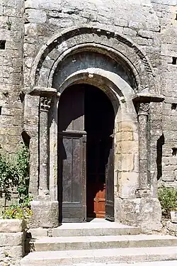 La façade méridionale est ornée d'un portail faisant saillie. Ce portail est encadré d'une paire de colonnes surmontées de chapiteaux sculptés de motifs végétaux. Il est surmonté d'une double archivolte. L'archivolte interne est biseautée et ornée de pointes de diamant : elle repose directement sur les piédroits, biseautés comme elle. L'archivolte externe repose sur les chapiteaux et est ornée d'une frise ornée de motifs décoratifs variés : damier, palmette, boules, pointes de diamant…