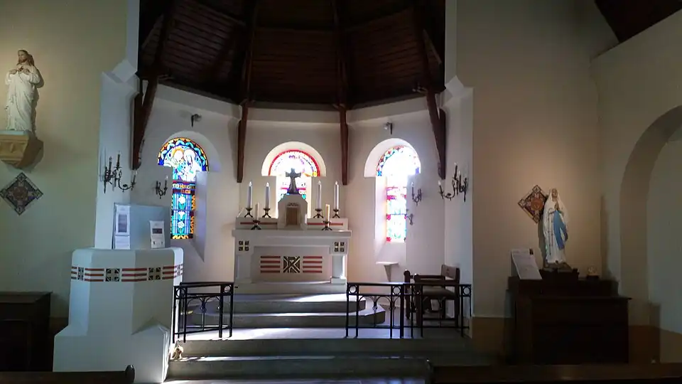L'édifice est composé d'une unique nef, sans bas-côté et sans transept. Le chœur, plus étroit que la nef se termine par une abside à trois pans.
