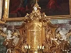 Les fresques du chœur mettent en scène le Couronnement de la Vierge (1750).