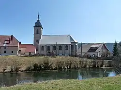 L'église présente un clocher-porche surmonté d'un dôme impériale (Dôme galbé franc-comtois). À l'intérieur, la nef est soutenue par des colonnes doriques ainsi que des pilastres[3]. L'abside en cul-de-four abrite le maître-autel[3].