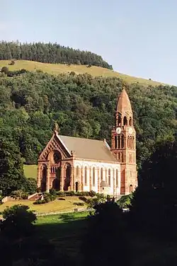 Merveilleusement située en fond de vallée et au centre d'un site exceptionnel, cette église-mémorial est consacrée aux morts de la guerre de 1914-1918 dans les Vosges et notamment à ceux tombés lors de la très meurtrière bataille de Metzeral en juin 1915. Une dédicace en lettres majuscules se détache de l'harmonieuse façade : "À nos vaillants soldats, l'Alsace reconnaissante".