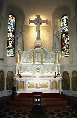L'intérieur du sanctuaire dégage une même force, à la fois solennelle et simple, de juste harmonie des formes. Chef-d'œuvre de l'église, le maître-autel est fait de marbre blanc de Carrare que surmonte un calvaire grandeur nature. Le long de la nef, dans les arcades de 1,80 m de haut, sont placées des plaques de marbre jaune de Sienne sur lesquelles sont gravés les noms des soldats tombés dans les Vosges.